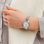 بدنه و قاب استیل با رنگ نقرهای، بند استیل، و صفحه سفید ظاهر تمیز و مدرنی به محصول میدهد. شیشه مینرال مقاومت خوبی در برابر خراش دارد و موتور باطری بهراحتی زمان را مشخص میکند.