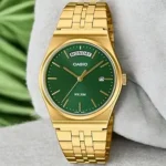 ساعت مچی کلاسیک مردانه کاسیو مدل MTP-B146G-3AVDFساعت مچی ماندگار استایل کلاسیک را با خود دارد. مدل MTP-B146G-3AVDF از برند معتبر کاسیو یک گزینه عالی برای آقایانی است که به دنبال ترکیبی از عملکرد و ظرافت هستند. این ساعت با موتور کوارتز دقیق کار میکند، بدنهای از استیل ضدزنگ دارد و قاب آن به رنگ طلایی با سطحی صاف و بیعیب است. طراحی گرد قاب و بند یکپارچه استیل، به همراه صفحه سبز رنگ، جلوهای مینیمالیستی و در عین حال لوکس به دست میدهد. این ویژگیها باعث میشود در هر محیطی از سالنهای رسمی تا استفاده روزمره، بدرخشید.